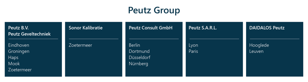 Peutz bietet eine unabhängige Beratung, spezialisiert auf ein breites Spektrum von Fachbereichen. Diese reichen von Akustik, Bauphysik und Stadtbauphysik über Schallschutz und Umwelttechnik bis hin zur Baudynamik, Nachhaltigkeit und Optimierung der Arbeitsbedingungen. Die Peutz Group ist in den Niederlanden, Deutschland, Frankreich und Belgien ansässig. Ihre 5 Beratungsunternehmen mit über 300 Mitarbeitenden sind an 12 Büro- und 5 Laborstandorten ansässig.